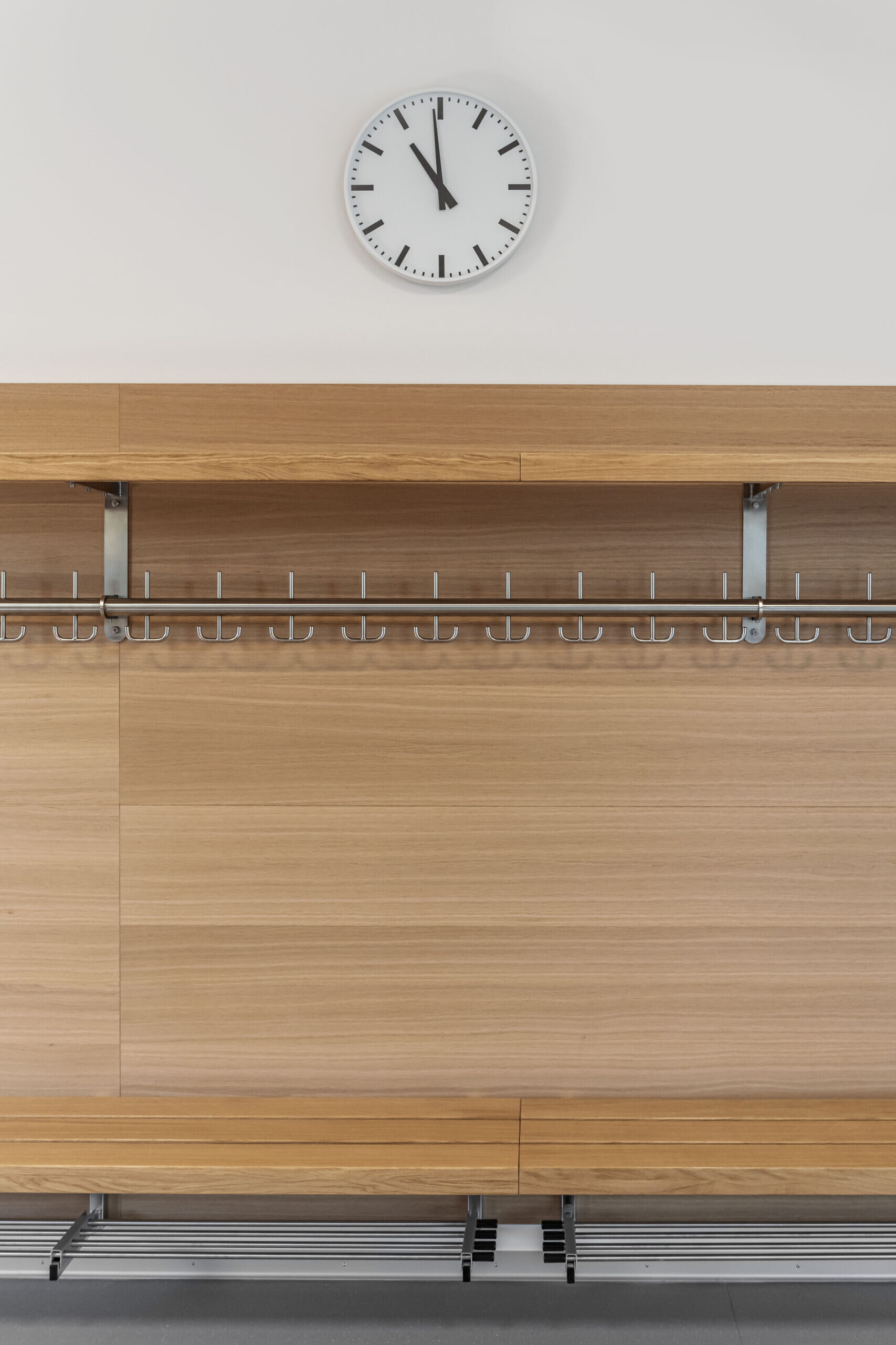 La paroi en bois qui donne du caractère à l’espace est une cloison légère plaquée de chêne, spécialement conçue pour cette école. En harmonie avec le chêne du banc, de l’étagère et du fond, les crochets d’ancrage en acier inoxydable de notre programme de vestiaires mural VARIAL ont une apparence à la fois sobre et exclusive. Cette garde-robe murale séduit par son style et sa fonctionnalité, et traversera le temps.