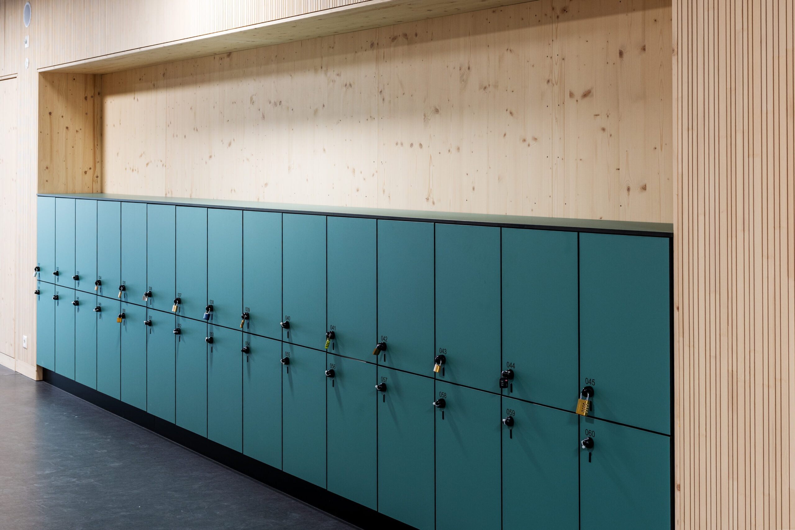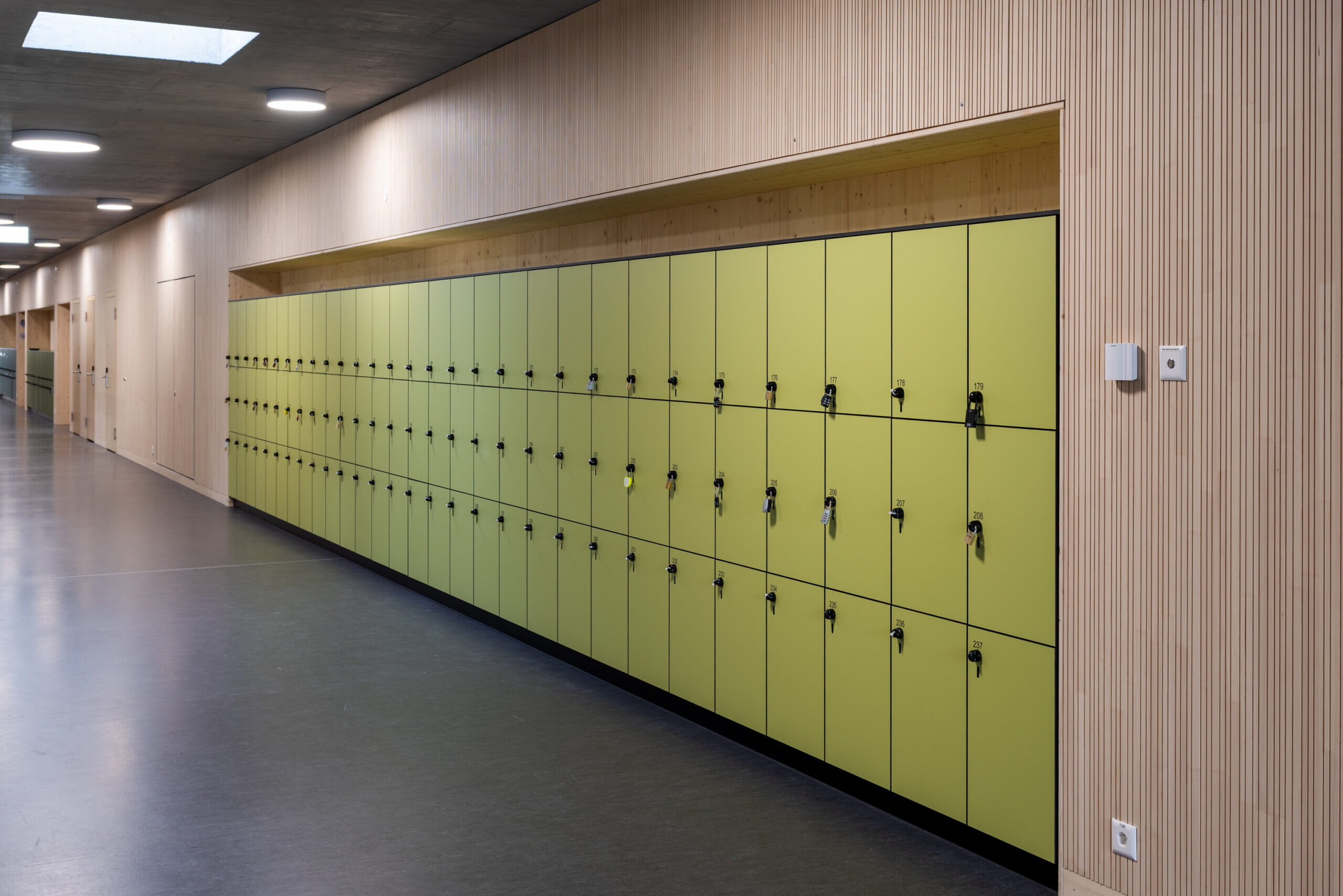 Im Collège de Chanel in Morges (VD) wurden hochwertige HPL-Schränke installiert, die höchste Ansprüche an Langlebigkeit, Funktionalität und Ästhetik erfüllen. In den Umkleideräumen der Turnhalle sorgen robuste Holzsitzbänke, klappbare Bänke und die unverwüstliche Garderobenleiste RUNDROHR für eine ordentliche und funktionale Aufbewahrungslösung.