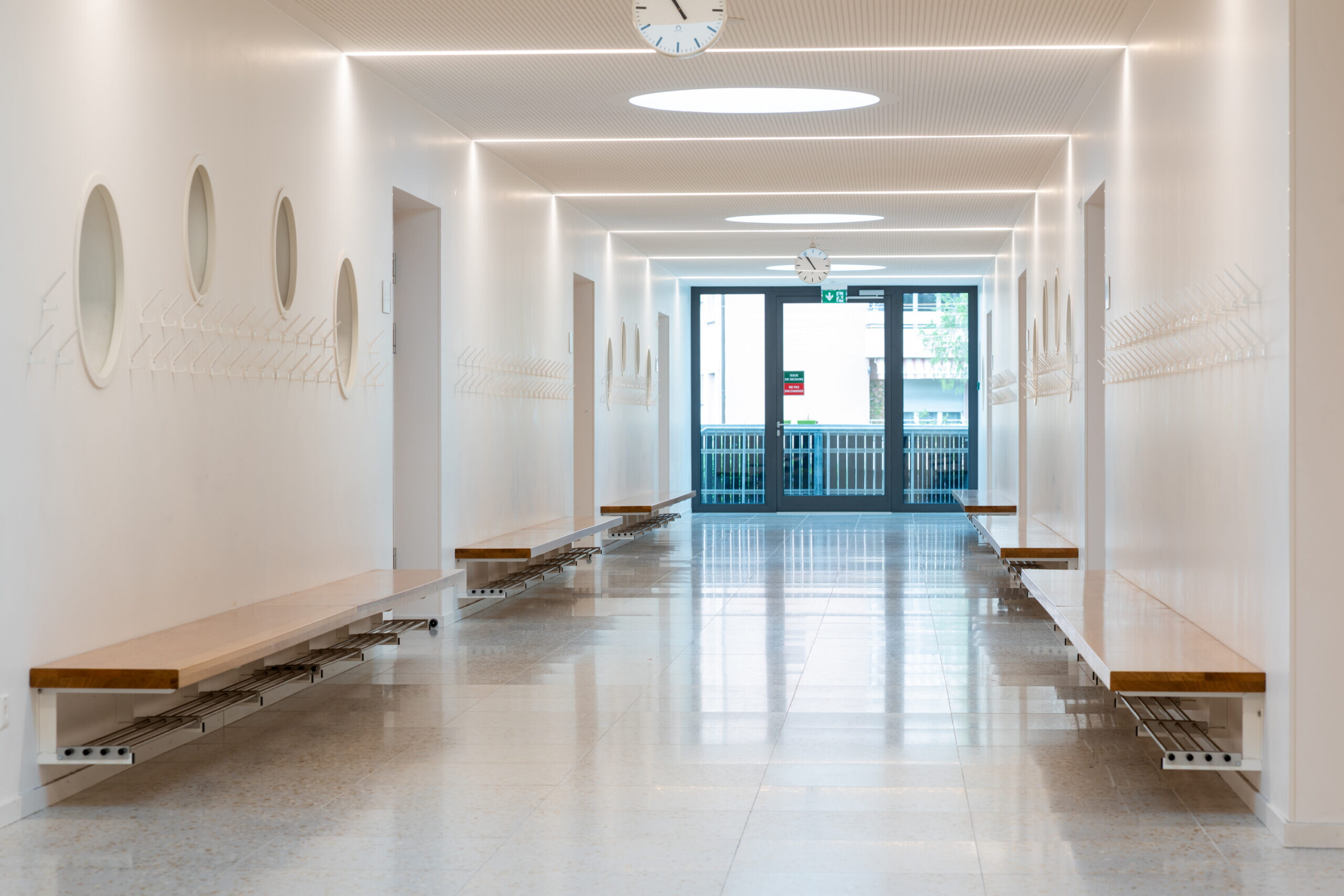 Ein einzigartiges Objekt mit einer aussergewöhnlichen Garderobenlösung: Gelungene Ästhetik im Collège de Cheseaux oberhalb Lausanne. Passend zur Architektur wurden 400 Einzelhaken in den Gängen angebracht. Der Verzicht auf Garderobenschienen und die versetzte Anordnung der Garderobenhaken unterstreichen die verspielte Anmutung der oberen Geschossräume mit den runden Guckloch-Fenstern und Oblichtern. Massive, einlattige Sitzbänke in lackierter Eiche geben optischen Halt und lassen im Kontrast dazu die Garderobenhaken noch mehr „schweben“.