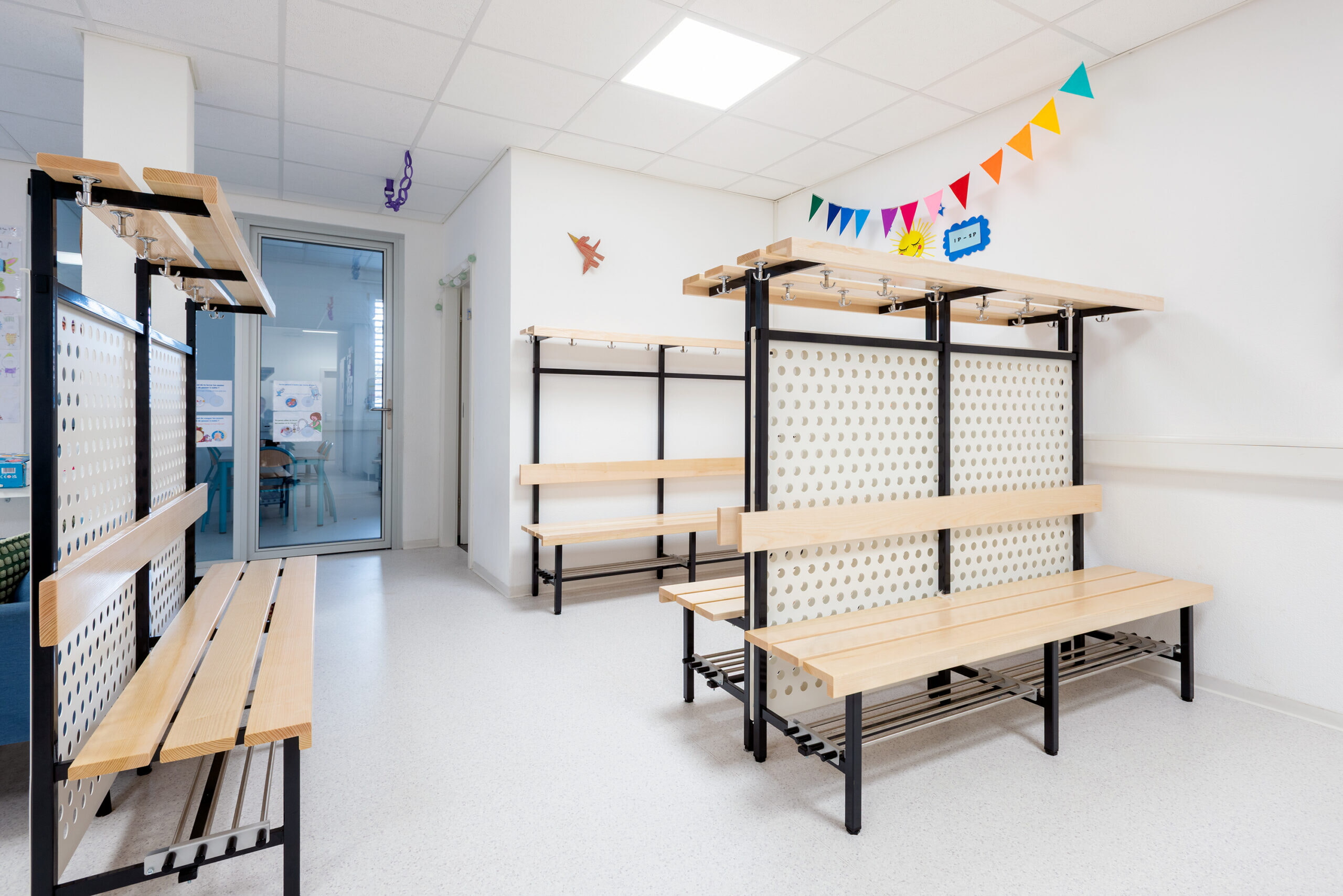 Unsere freistehende Sitzbankgarderobe ist der zeitlose Klassiker in Schulen, Kindergärten und Kitas. Als Doppel-Sitzbank-Garderobe freistehend im Raum oder als einseitige Sitzbankgarderobe an der Wand oder ebenfalls freistehend im Raum. Ein stilvoller und funktional überzeugender Klassiker, der in jeder Umgebung gut aussieht. In der Kita UAPE in Cossonay VD in einem modernem, frischen Look.