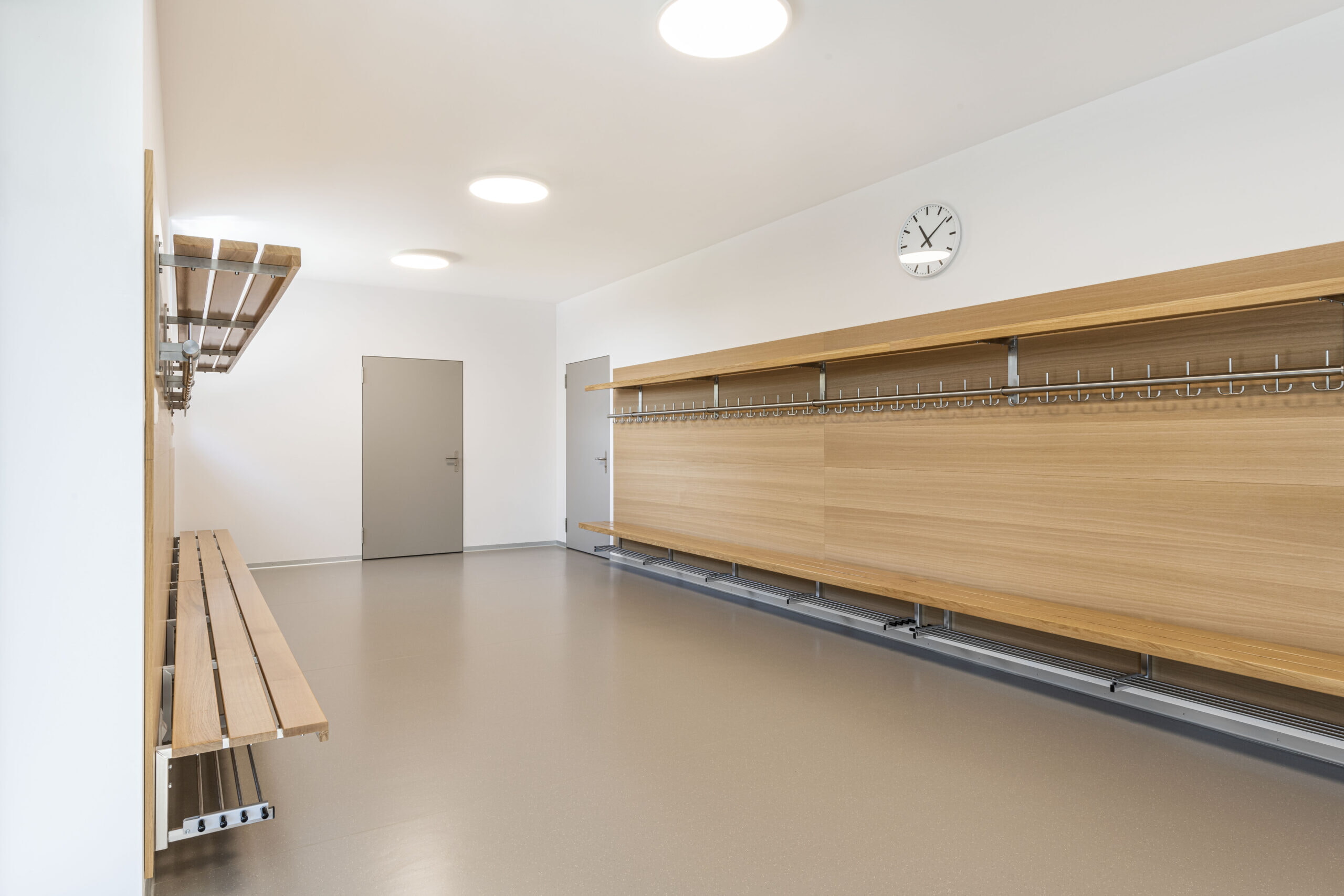 Die raumprägende Holzwand ist eine mit Eichenholz furnierte Leichtbauwand und wurde speziell für dieses Schulhaus entwickelt. Im Zusammenspiel mit dem Eichenholz der Sitzbank, der Ablage und der Rückwand wirken die Edelstahl-Ankerhaken aus unserem Wandgarderoben-Programm VARIAL schlicht und exklusiv. Diese Wandgarderobe überzeugt in Stil und Funktionalität – und wird die Zeit überdauern.